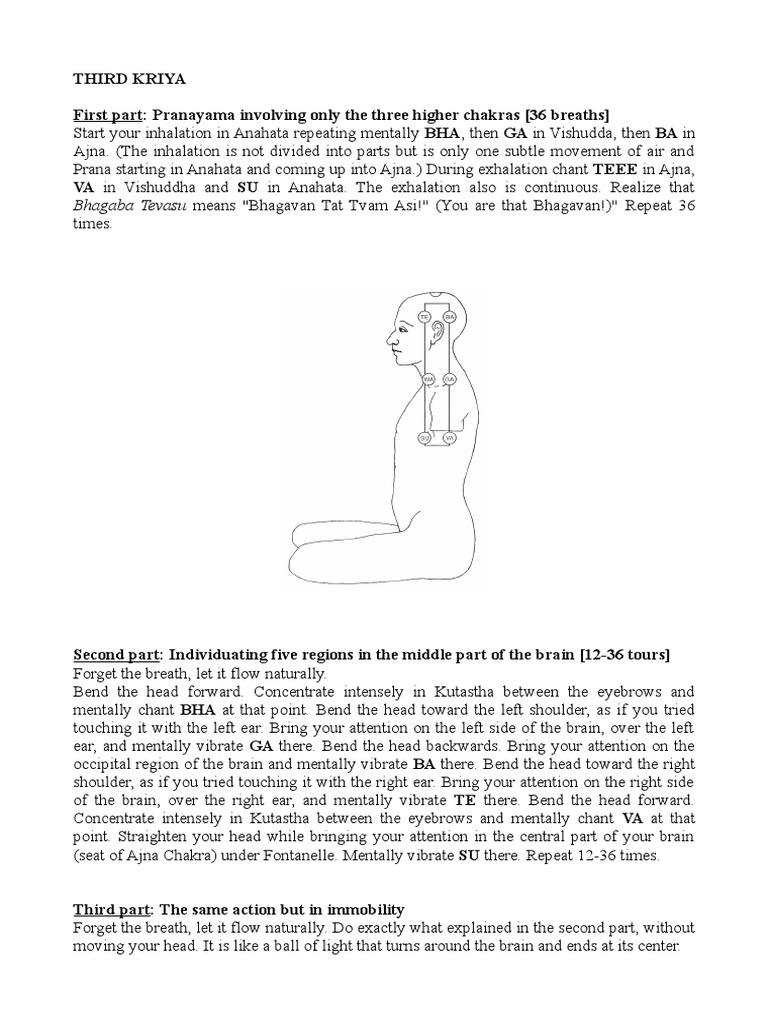 Om Chant chanting to create vibrations and healing. Kriya Kundalini Pranayama 48 breaths Matreika Pranayama 5-25 breaths Technique. Kriya yoga is a traditional technique that includes a set of breathing exercises and postures that are designed to purify the body.
